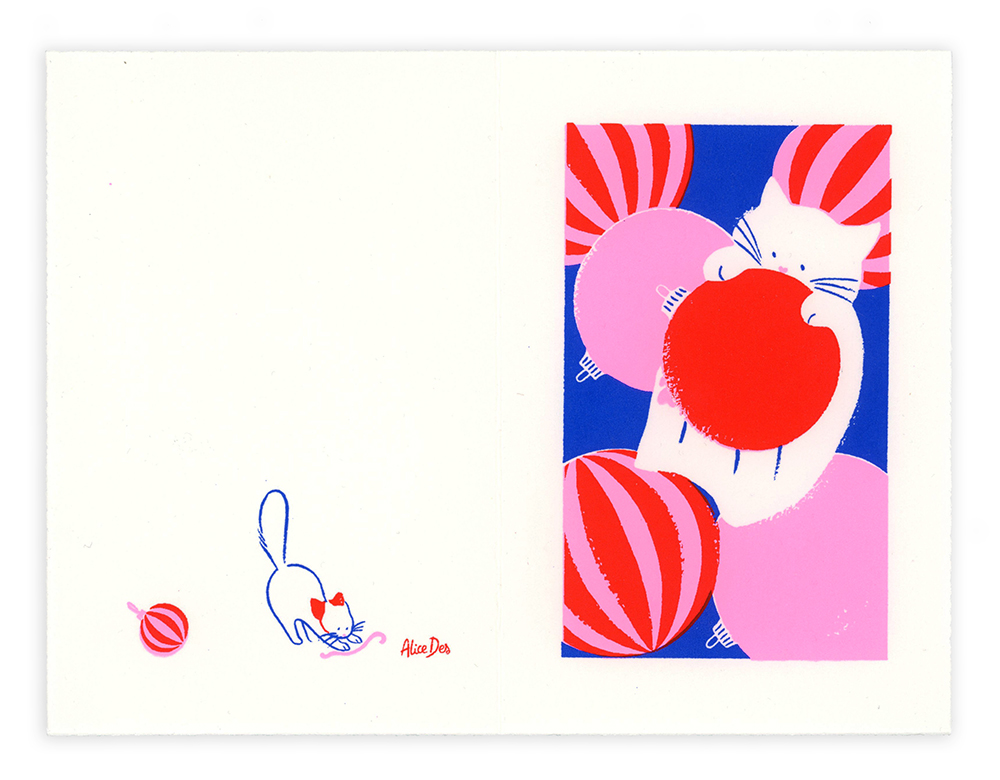 Carte de voeux  « Le Chat qui joue », format 10cm x 15cm, dessinée à la main avec amour et imprimée en sérigraphie à Paris, en 3 passages (rose fluo, rouge et vert), sur papier aquarelle fine arts 100% coton 300g, et son enveloppe verte assortie.