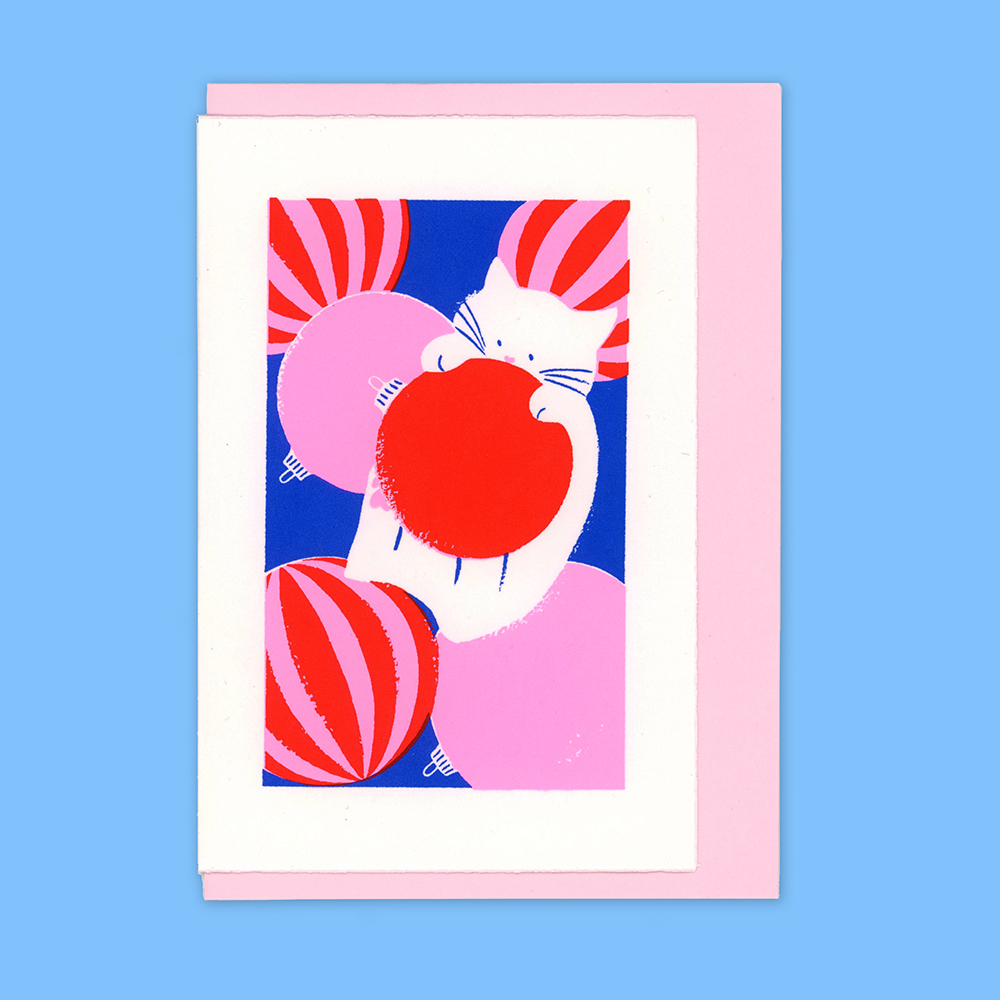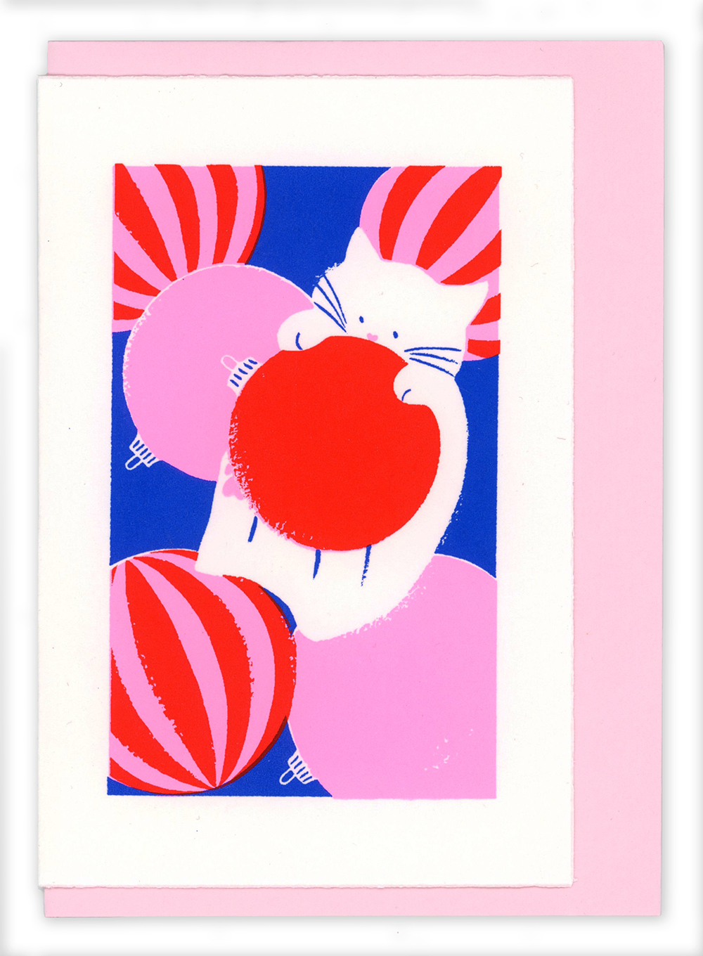Carte de voeux  « Le Chat qui joue », format 10x15cm, en sérigraphie en 3 passages (rose fluo, rouge et vert), avec son enveloppe verte.